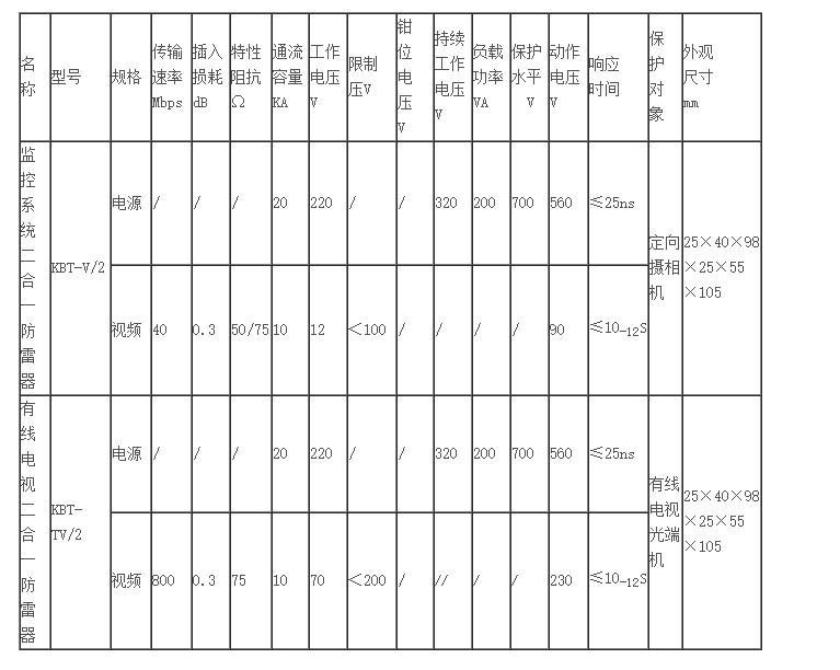 監(jiān)控多功能二合一防雷器是根據(jù)監(jiān)控系統(tǒng)的特點量身打造的專用防雷設備,它集電源防雷器、視頻線路防雷器和控制線路防雷器于一體,各部分均采用多級串聯(lián)式結構設計,具有多級保護功能,適用于公共場所、各種樓宇、機場、海關、軍事基地等各種重要安防設施的室內、室外監(jiān)控攝像槍的防雷擊電磁脈沖保護。KBT—V/2用于不帶云臺攝像槍。